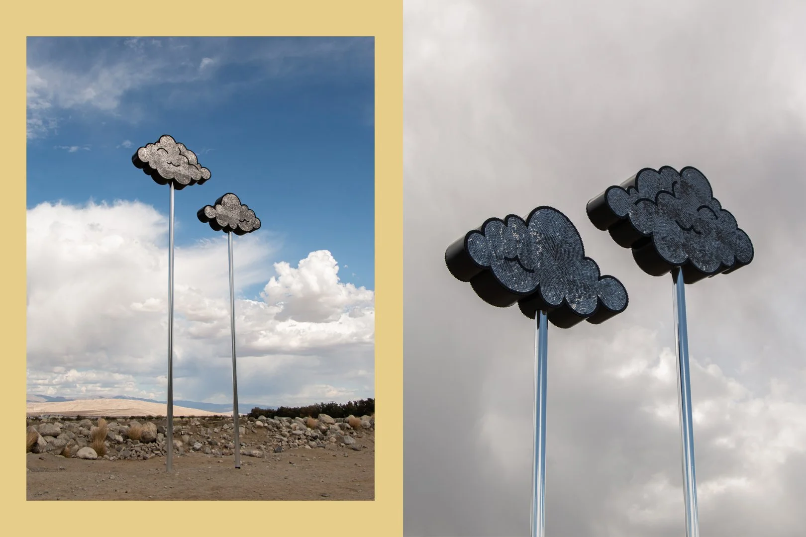 Sanford Biggers' installation, Unsui (Mirror), features two towering sequin-covered sculptures depicting cloud forms. Standing over 30 feet tall, these shimmering clouds are set against the expansive desert sky, symbolizing freedom, boundlessness, and interconnection. The term "unsui" translates to "clouds and water" in Japanese, reflecting Biggers' study of Buddhism and embodying the concept of unencumbered movement. The sculptures' reflective surfaces interact dynamically with sunlight and wind, creating an ever-changing visual experience that evokes feelings of timelessness and transcendence. Their placement at the James O. Jessie Desert Highland Unity Center—a historic Black community established in the 1960s after the displacement of residents from Section 14—adds layers of cultural and historical significance, conveying messages of hope and resilience.
