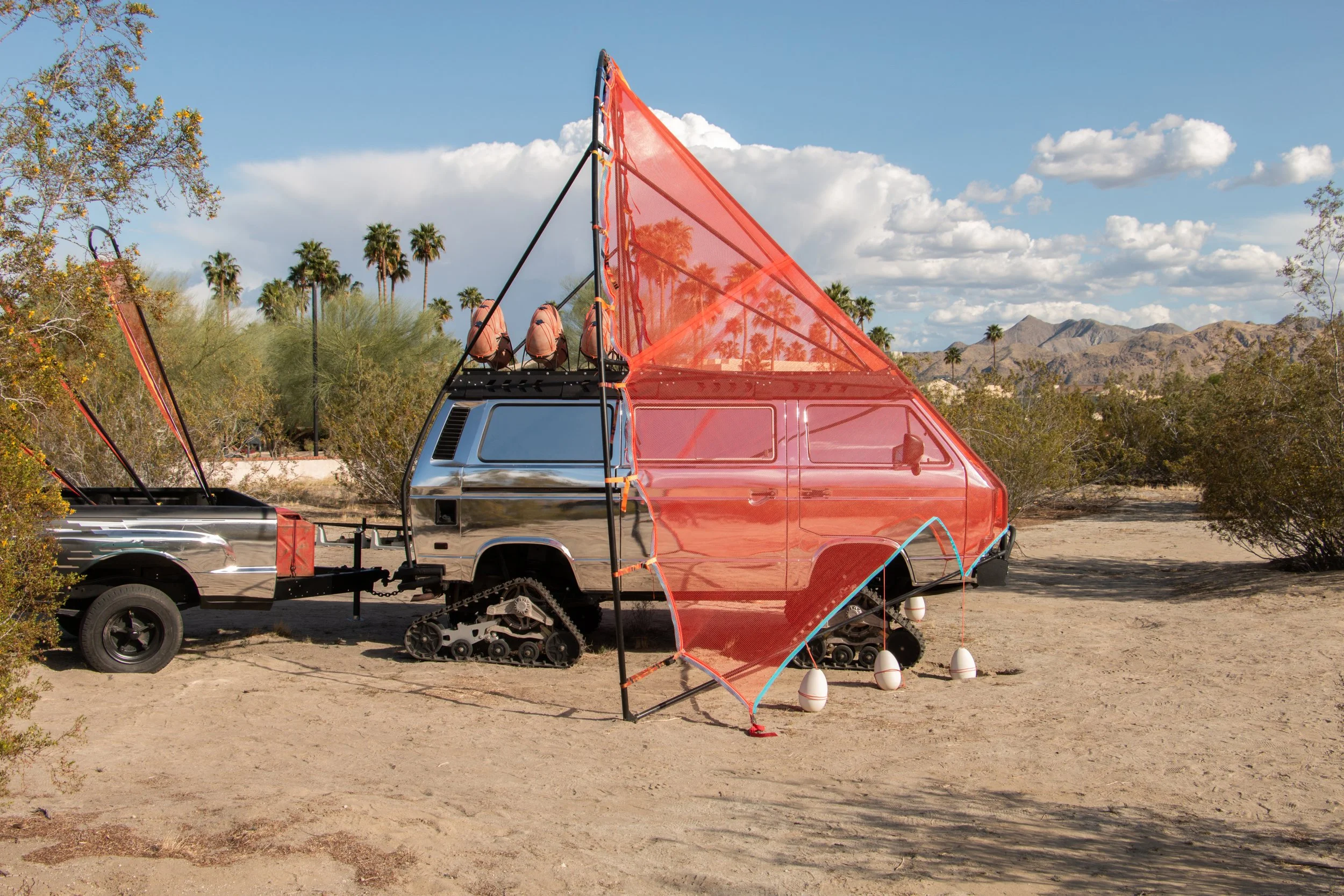 Cannupa Hanska Luger's G.H.O.S.T. Ride is a nomadic, futuristic vehicle that reimagines his earlier work, the Repurposed Archaic Technology vehicle (RAT Rod). This mobile installation traverses the Coachella Valley, serving as a moving testament to Indigenous innovation and sustainable living practices. The vehicle is adorned with elements inspired by Indigenous technologies, blending traditional knowledge with speculative futures. Luger describes the inhabitants of this vehicle as descendants of Indigenous communities who have developed and sustained a harmonious relationship with the land. Through G.H.O.S.T. Ride, Luger invites viewers to reconsider their relationship with the environment and envision alternative, sustainable futures that honor Indigenous wisdom and practices.