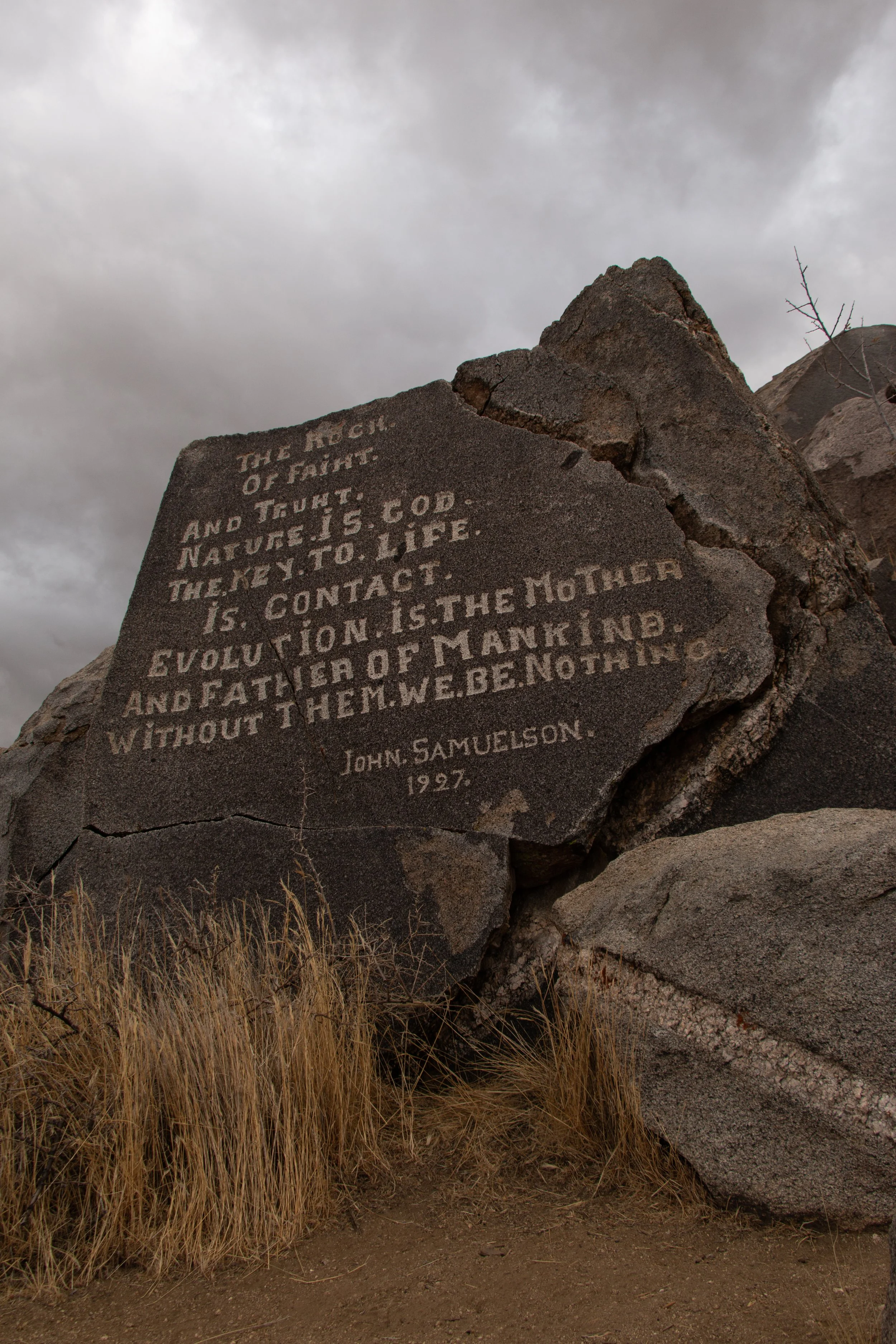 Here, in the late 1920s, a Swedish homesteader named John Samuelson carved his thoughts directly into the desert itself. The site consists of seven rocks (eight inscriptions in total) etched with musings on nature, politics, and society. The grammar is unpolished, the spelling inconsistent, but the voice is unmistakable: sharp, restless, and unafraid.